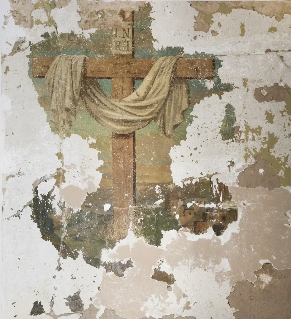 When St. Joseph of the Holy Family started our Renew + Rebuild Campaign in 2017, we began the process of renovating and restoring all aspects of the Church. While contractors were repairing the north east wall by the altar to prime for paint this cross was uncovered. We believe this is an original painting created in 1889.